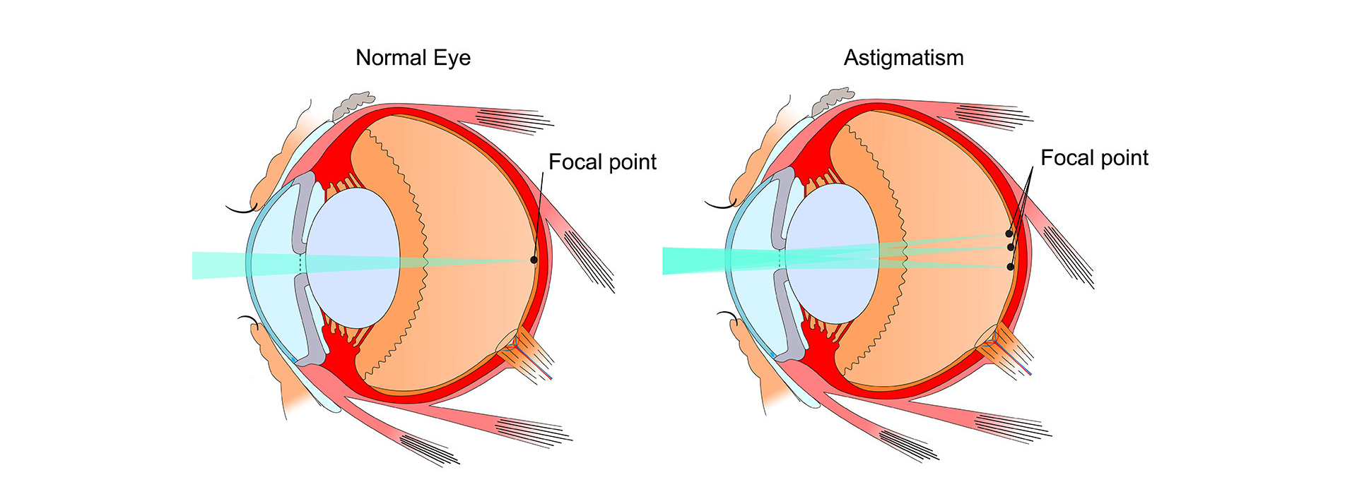 Στον αστιγματισμό και τα μακρινά και τα κοντινά αντικείμενα φαίνονται παραμορφωμένα. Αυτό συμβαίνει επειδή n καμπυλότητα του κερατοειδούς δεν είναι ομοιόμορφη σε όλη του την επιφάνεια, με αποτέλεσμα οι ακτίνες του φωτός να μην εστιάζονται στο ίδιο επίπεδο.